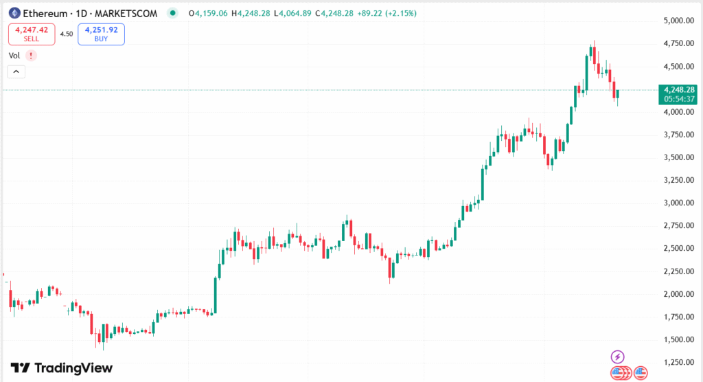 • ETH needs to sustain the $4,100–$4,000 support level; a failure would see it move down to $3,500, while a recovery above $4,500 can revive the bull momentum.