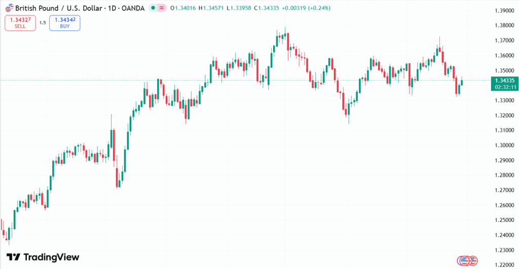 GBP/USD currency pair crept higher on Monday, fluctuating at 1.3430, as increasing anticipation of Federal Reserve rate reductions put pressure on the US Dollar. Although the Bank of England is likely to maintain rates unchanged, fears of a US government shutdown along with hawkish statements by Fed policymakers introduced volatility into the market. Upbeat US economic news, such as a 4% increase in Pending Home Sales, was countered by the threat of a BLS data blackout. The Pound also received support from central bank divergence and political attention on the UK Labor Party conference, leaving investors optimistically cautious.