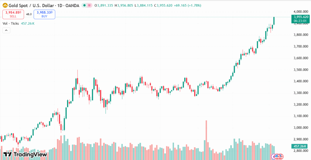 Gold jumped above $3,900 as safe-haven demand increased on the US government shutdown and global political uncertainties. XAU/USD rose to a record high of $3,949, as expectations of more Fed rate cuts and ongoing geopolitical tensions fueled the rally.