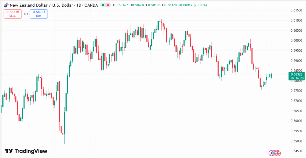 NZD/USD currency pair pulled back from initial gains on Monday, trading at around 0.5815 as investors took a guarded approach following the Reserve Bank of New Zealand’s (RBNZ) policy decision. The anticipation is strong for a 25 basis point rate reduction to 2.75%, sparked by New Zealand’s poor GDP numbers and growing apprehensions of dwindling economic pace. In contrast, the US Dollar rallied following increased safe-haven demand in response to political unrest in France and ongoing threats of a US government shutdown. From a technical perspective, the pair flounders below its 20-day EMA at 0.5847, which points to bearish pressure potentially continuing if it is unable to retake the 0.5800 handle.